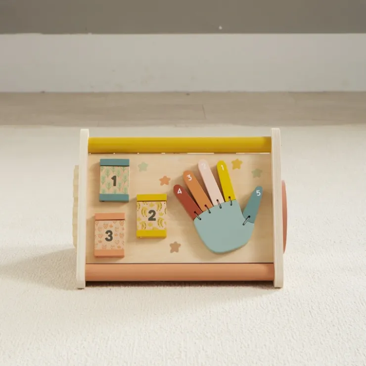 Looking at things from all angles, the best one is the Activity Triangle! 3 sides of fun activities plus more on each end make this baby toy a must. Made of wood, our triangle features counting hand, peek-a-boo numbered doors, an alphabet abacus with 2-sided graphics, a maze, a mirror, and gears. Theyll want to take it with them wherever they go!