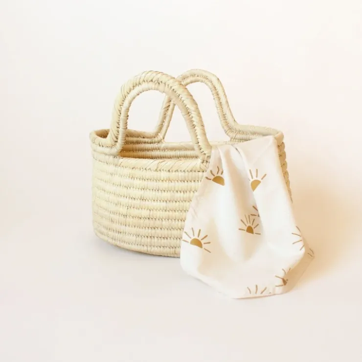 Hand woven basket made by empowered artisans in Turkana, Kenya. Comes with a Sunshine Print Baby Doll Blanket made with cotton blend fabric by our artisans in Mombasa, Kenya.