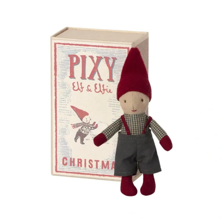 A lovely Maileg Christmas friend, the Maileg Christmas Pixy Elf comes in a beautiful matchbox with soft bedding. He fits perfectly into the Maileg Christmas story and the Maileg gingerbread house.