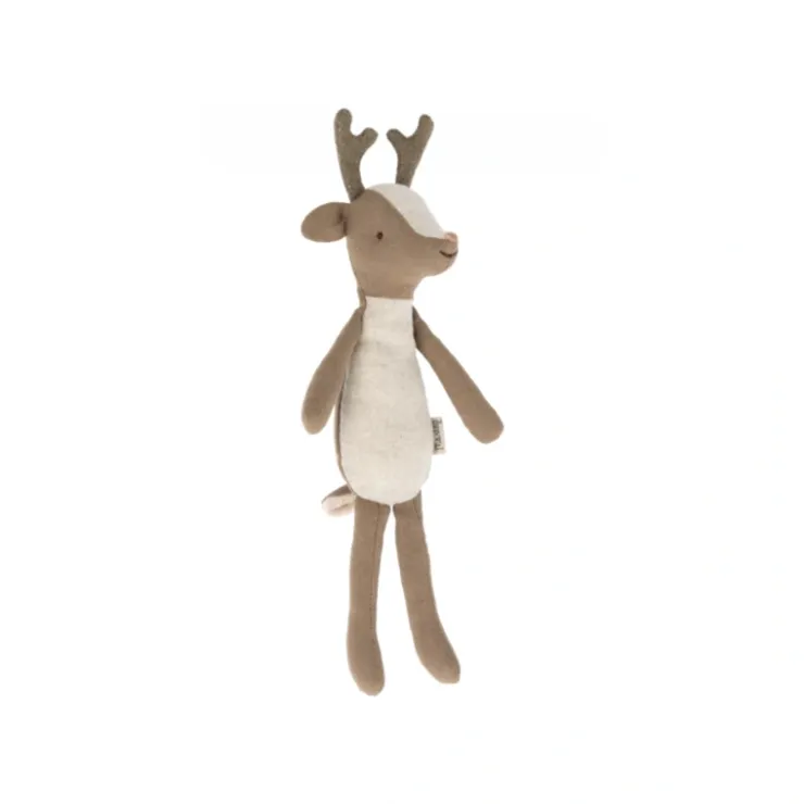 A sweet and adorable deer big brother. He lives in the small Gingerbread house with the rest of the deer family. Big brother has faux suede antlers that are so soft, and a fuzzy little tail. He has a cute pink nose that goes with his friendly face and smile so sweetly.