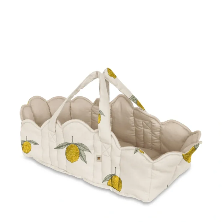Padded doll lift made in 100% cotton. Designed with practical carry straps, soft piping, and scallop hems.