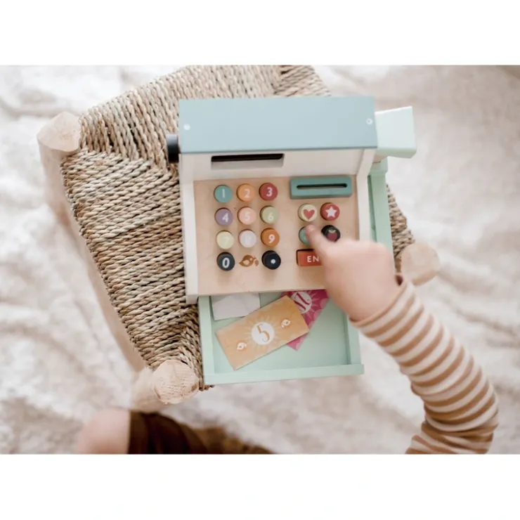 Ring up all your groceries with this fun and colorful wooden till with scanner. Slide your credit card along the groove, pop one of 5 printed receipts into a slot, turn the little knob to show different prices through a window, press down on the multi-colored squidgy buttons and open the tray to dispense 5 wooden coins and 9 sheets of colored paper money.