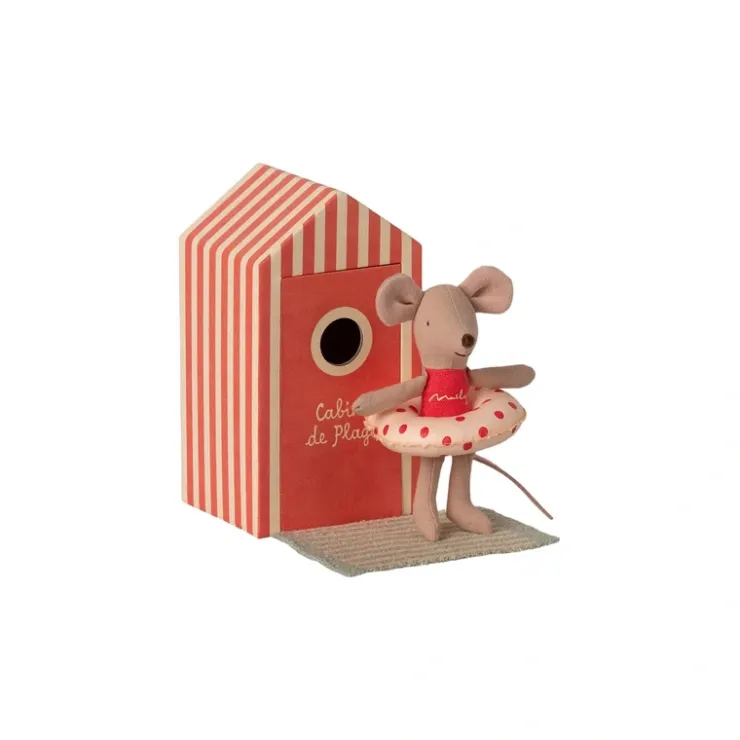 Vacation time! This mouse is ready for a day at the beach, with needed accessories and a beautiful striped beach house. As one of the smallest family members, she, of course, has a float to keep her safe during her seaside adventures with your cute doll.