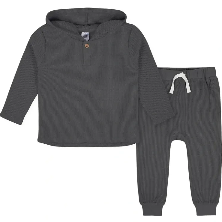 Our 2-piece long sleeve waffle hooded top and jogger is perfect for those cool Fall days! Each one is designed for easy dressing and all-day comfort, perfect for infants and toddlers. We use STANDARD 100 by OEKO-TEX certification on products tested in an independent laboratory against a list of more than 400 harmful substances, including PFAS. Pair with our Onesies Bodysuits or Solid Essentials for an extra layer of warmth!