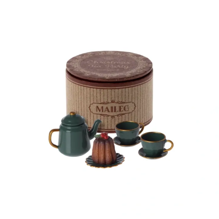 Decorate a cozy Christmas tea table with this lovely set. It is perfect in size for the mouse family. In the beautiful giftbox you find a metal tea pot, two cups, a plate and a deliciously decorated cake made in polyresin.