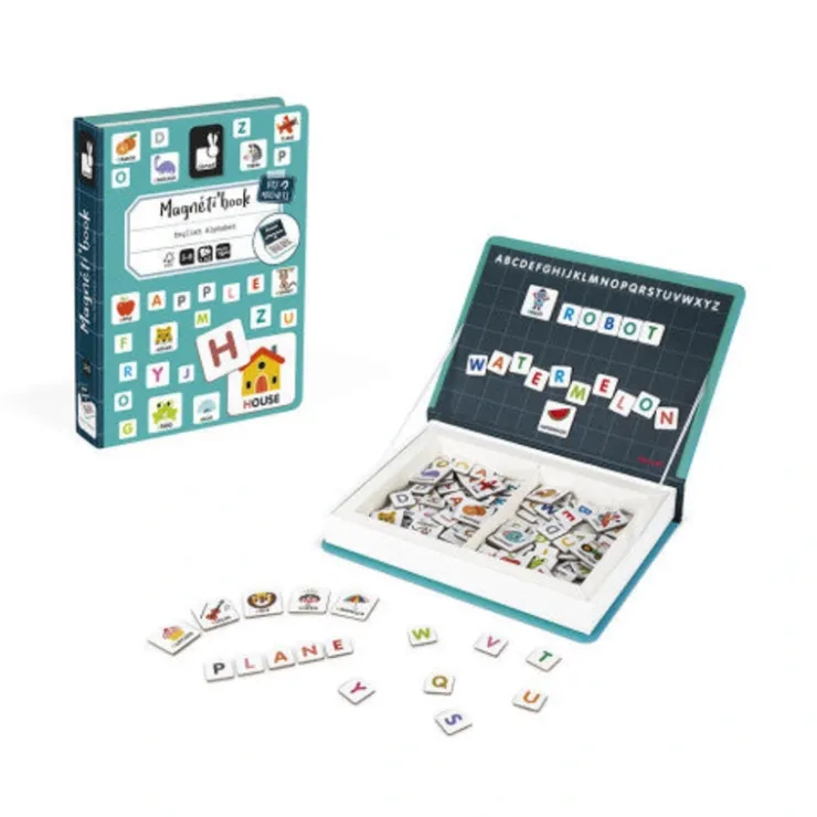 Magnetic educational game in cardboard to learn the alphabet in English. Composed of 26 illustrated magnets and 116 letters magnets. Once the book is opened, the aim is to write correctly on the stage the word indicated on the illustrated magnet. This product is made of FSC -certified and other controlled material.