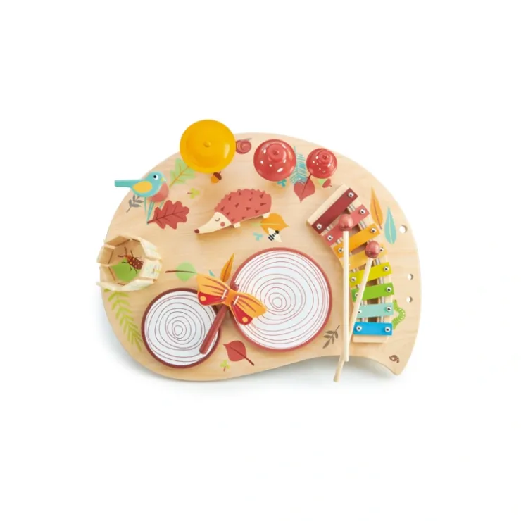 Compose a forest symphony! Musical notes roll off the xylophone and the mushroom bell tops jingle as you hit them with your acorn stick. Bang the tree trunk drums, blow through the birdie whistle, clack the butterfly wings, sound an echo with the stirring wood chime. Rub the stick along the hedgehog back, what a hullabaloo of musical notes!