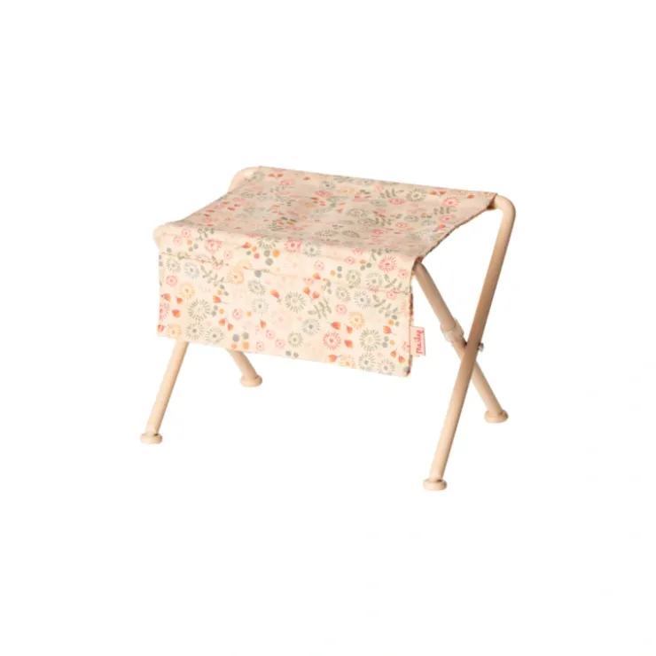 Our new, smaller Nursery Table has a fresh floral cotton cover with metal legs and is sized right for our micro friends and is a perfect fit for the dollhouse. Painted light pink.