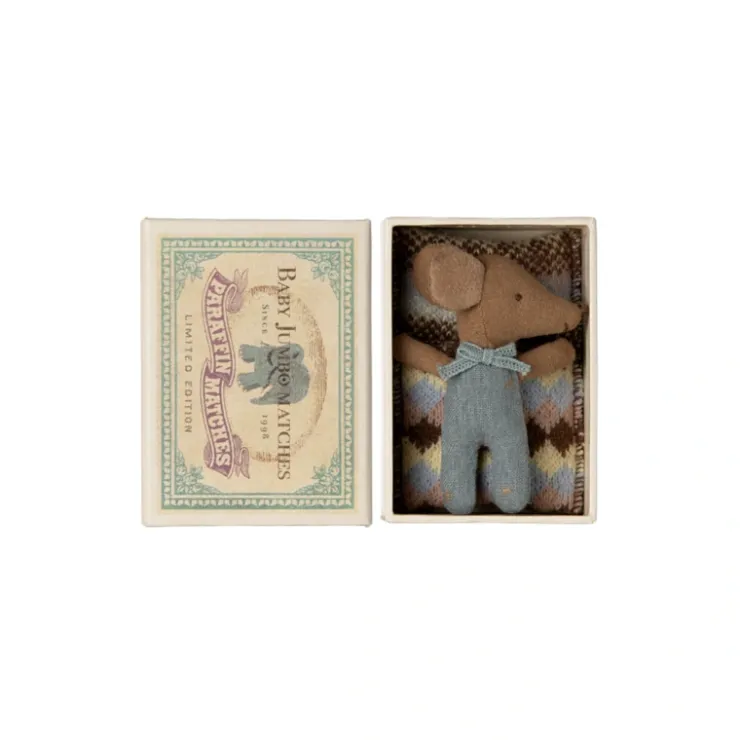 A classic Maileg item featuring the sleepy wakey baby mouse. This mouse is ready for hours of play and sleeps tight in the little matchbox. The clothes and bedlinen are made of soft fabrics with unique prints and beautiful colors.”