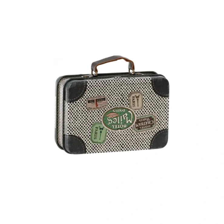 This metal suitcase from Maileg, thesmall travel off-white suitcase, is perfect for storing small items like jewelry or trinkets, or gifting small gifts and gift cards. The suitcase is adorned with colorful travel stamps, making it both stylish and unique. With its durable material and design, this piece ensures a safe place to store and organize your items.